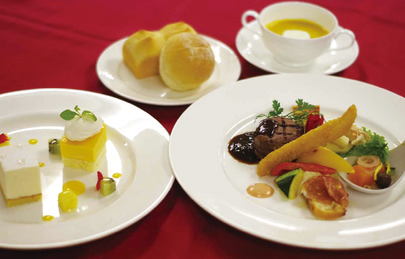 サーモンマリネ グリーンゴッデスソース・クルミとパルマハムのクロスティーニ・チキンのペンネサラダ・キッシュ・舌平目のフライ マンゴソース・牛フィレ肉の赤ワインソース/別添えで、カボチャのクリームスープ・パン・デザート・コーヒー付き ※写真はイメージ